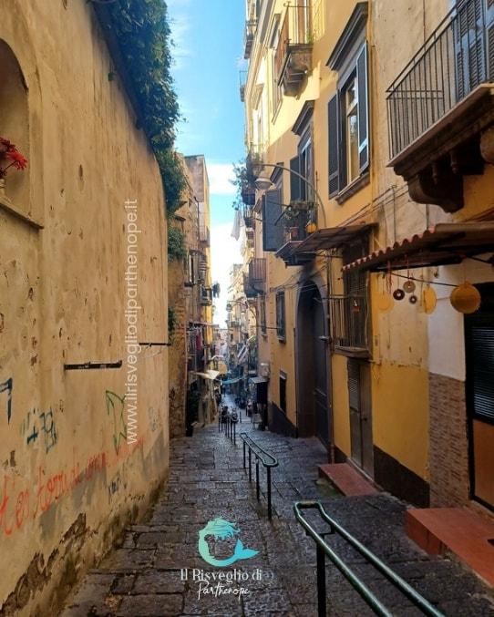 Salita TarsiaI percorsi verticali di Napoli hanno un fascino particolare. Vicoletti interrotti da scale da percorrere con calma per osservare piccoli scorci, cortiletti improvvisati in cui si respira una città autentica, un microcosmo nella metropoli che sembra essere fermo nel tempo, non disturbato dal frastuono delle automobili. Napoli ne è piena. Quelli non riscoperti e valorizzati nei circuiti turistici restano appannaggio dei cittadini come scorciatoie per raggiungere dalla zona collinare il centro della città in pochi minuti. E sono ascese e discese colme di storia. Salita Tarsia è una di queste e congiunge piazza Mazzini a Montesanto. Si sviluppa in un vicoletto fatto di tratti rettilinei e tornanti spezzati da gradinate. Era l’alveo naturale delle acque che scorrevano dalla collina del Vomero, un terreno molto scosceso ed erto in gran parte coltivato a vigneto, sul quale fino al tempo dei vicerè spagnoli era proibito costruire. In realtà già dalla metà del ‘500 quando si era aperta la via dell’Infrascata, c’erano anche dei giardini e qualche palaziata nobiliare.