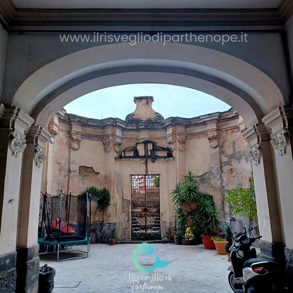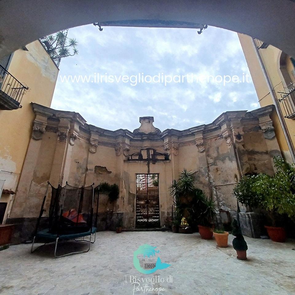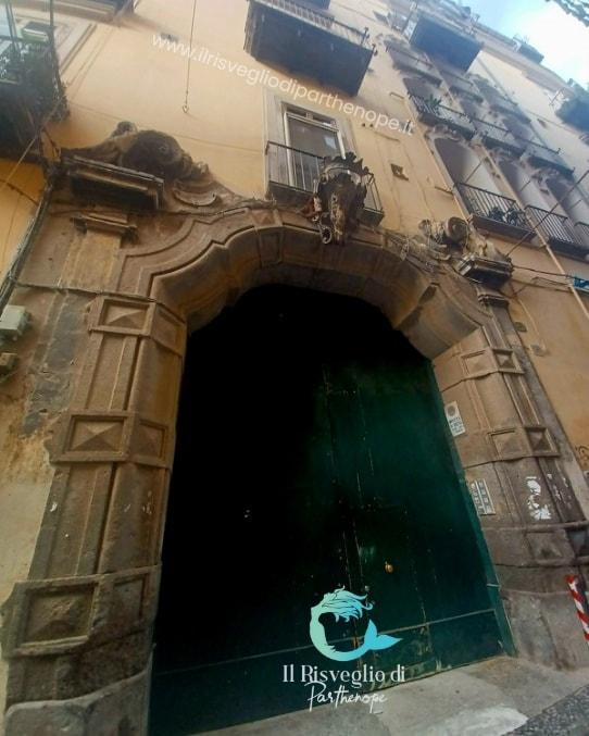 Appena terminato un tratto di scale, al civico 47 c’è un portale lobato in piperno di epoca settecentesca sormontato da uno stemma e accanto ad esso una bellissima scala aperta a tre archi incorniciati da stucchi barocchi, opera di Nicola Tagliacozzi Canale. Fortuna ha voluto che il portone fosse aperto, giusto per ammirare per qualche istante il bellissimo cortile con esedra dal quale si accede attraverso un cancelletto ad un giardino retrostante.