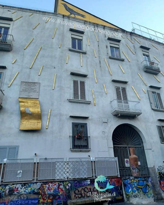 E’ il palazzo Tortora Brayda, antica famiglia nobiliare di origini piemontesi insediata a Napoli già al tempo di Carlo d’Angiò. Ad essa apparteneva anche il palazzo attiguo all’uscita secondaria della metropolitana di Salvator Rosa. Impossibile non ammirarne la facciata decorata da una pioggia di raggi dorati, opera di Mimmo Paladino, a ricordare Giovanni Capurro, l’autore di ‘O sole mio, che vi abitò. Sulla sommità del palazzo, su uno sfondo di oro l’immagine di un uccello rievoca lo stemma della famiglia Brayda Tortora, i primi proprietari del palazzo. Palazzo Tortora Brayda